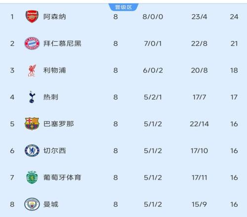 1,随着本菲卡4-2的获胜,皇马的惜败,本赛季欧冠联赛,直接晋级的8支球队包括:英超的阿森纳、利物浦、热刺、切尔西、曼城。多达5支!此外,德甲的拜仁、西甲的巴萨以及葡超的葡萄牙体育也直接晋级。