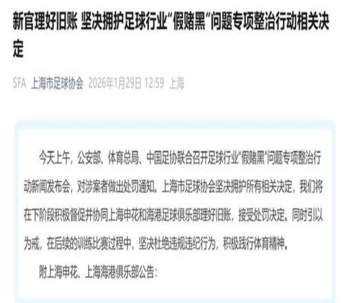 1 月 29 日上午,国家体育总局、公安部、中国足协联合召开新闻发布会,介绍足球行业 “假赌黑” 问题专项整治行动的相关情况,13 家俱乐部被罚。其中,两支申城中超球队都收到处罚决定:上海申花被扣 10 分并罚款 100 万元,上海海港足球俱乐部被扣 5 分并罚款 40 万元。