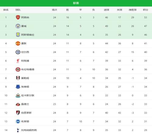 随着曼联32+曼城22爆冷!英超最新积分榜:维拉丢分红魔回前四